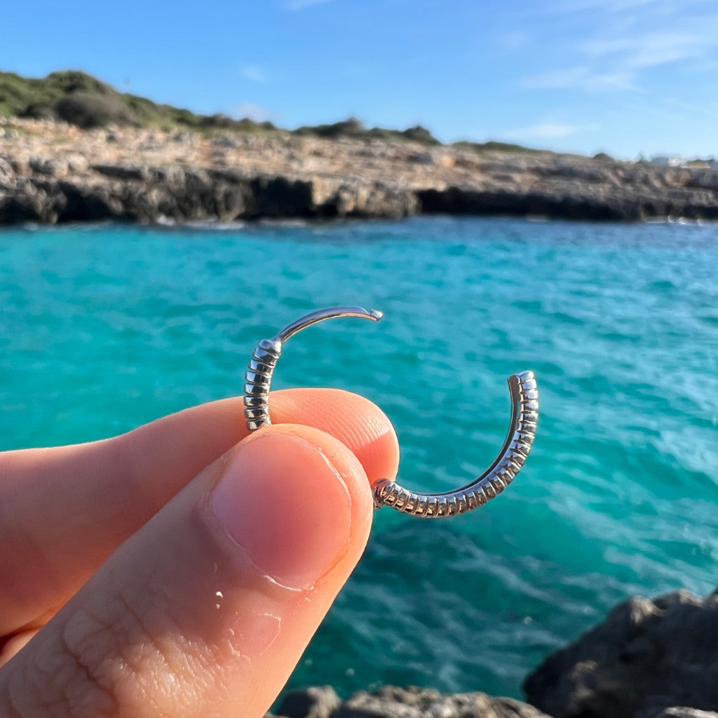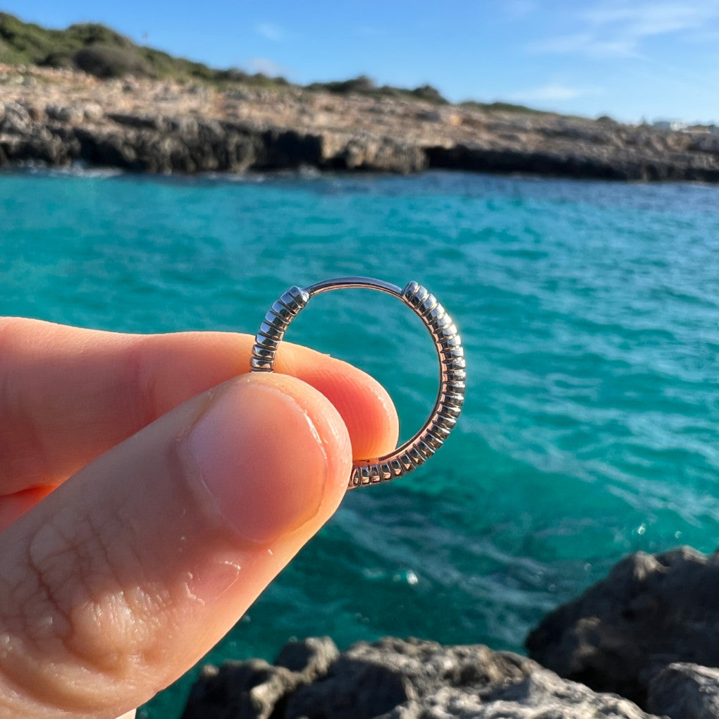 The basic piece for any jewellery box, the DERU earrings are a hoop with a twist. You can choose between two sizes: 14mm, which usually fits very well in the second hole, snug against the ear, or 20mm, ideal for everyday wear. They are very comfortable and light.