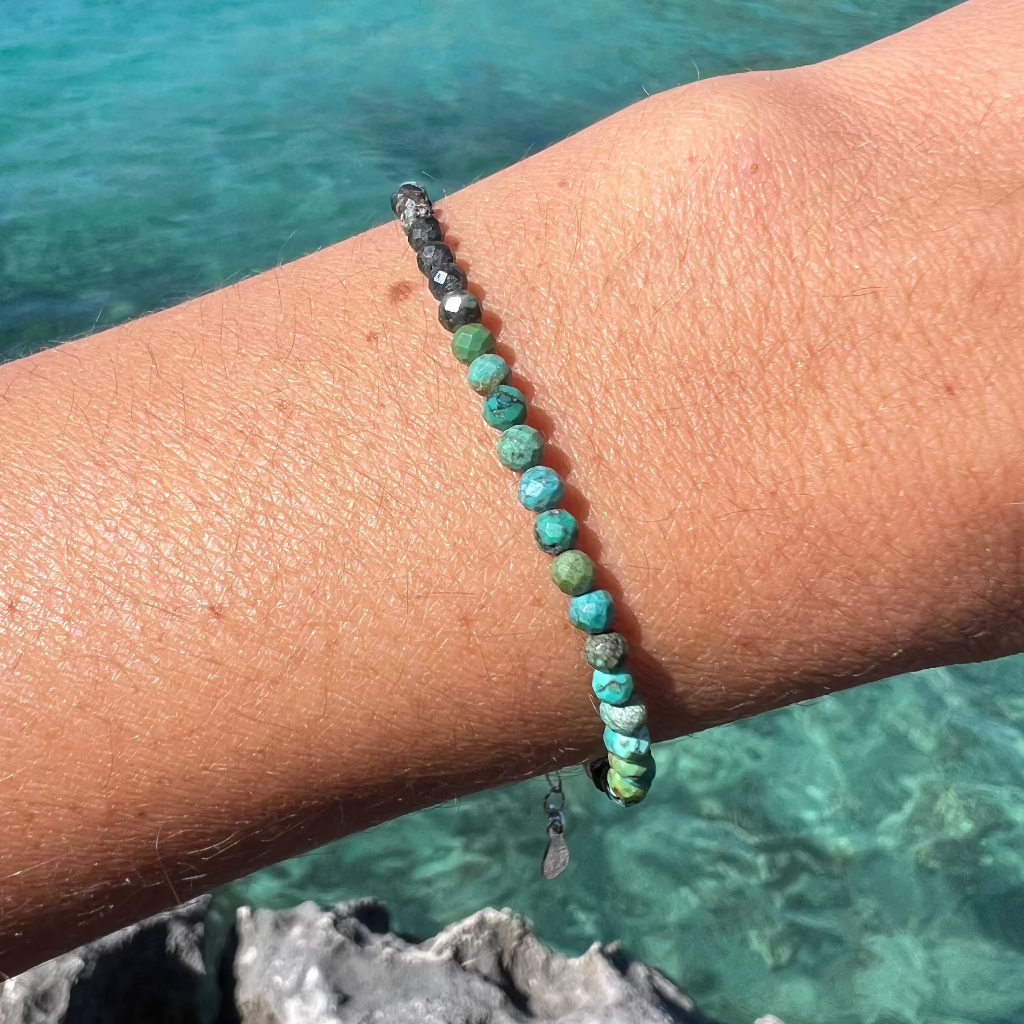 The GRADE bracelet is made from the semi-precious natural stone Chrysocolla with a gradient color effect . The size of the stones is approximately 3mm. Its 925 Sterling Silver finish gives it a fine and elegant style. It is durable, you can wear it in your daily life and bathe with it.