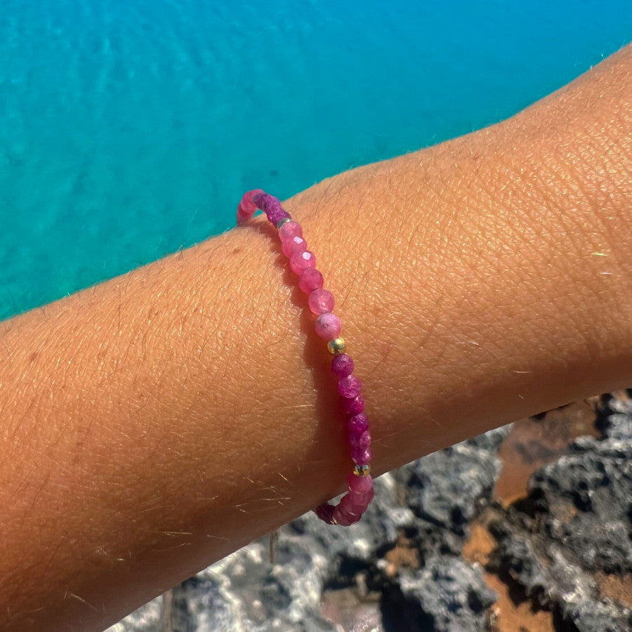The ESCACS bracelet is crafted from Ruby and Pink Tourmaline stones . The stones measure approximately 2 mm. Its 925 sterling silver finish gives it a fine and elegant style. It's durable enough to wear every day or even bathe in.