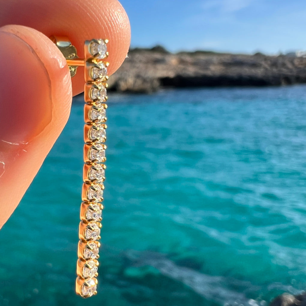 Los pendientes NIRA son pura elegancia con un toque de diversión, ideales para ocasiones especiales. Sus circonitas blancas forman una cadena de 3cm de largo, dando una caída y un movimiento espectaculares a la joya. Nos sumamos a la tendencia de pendientes largos.