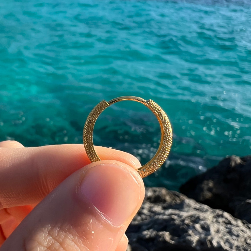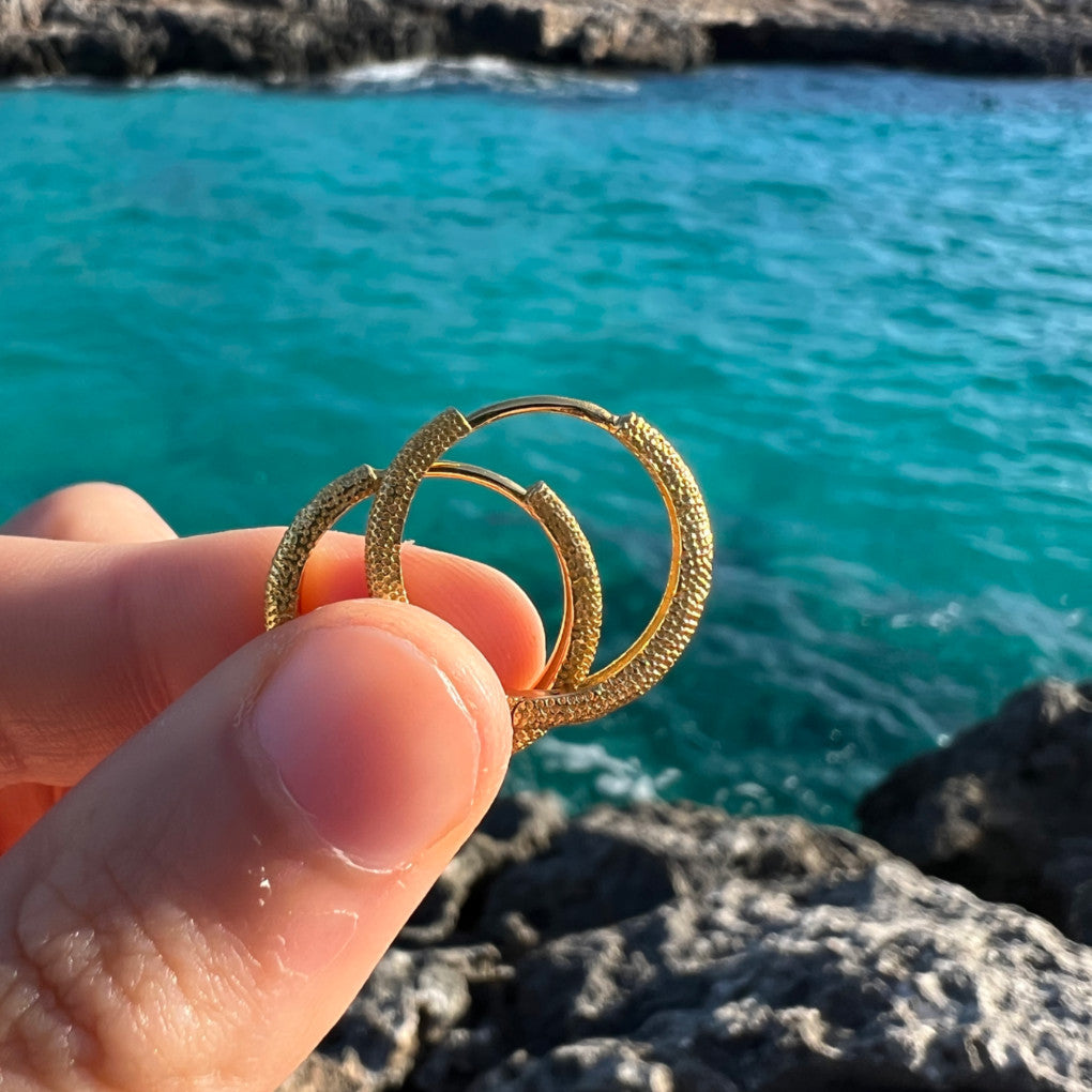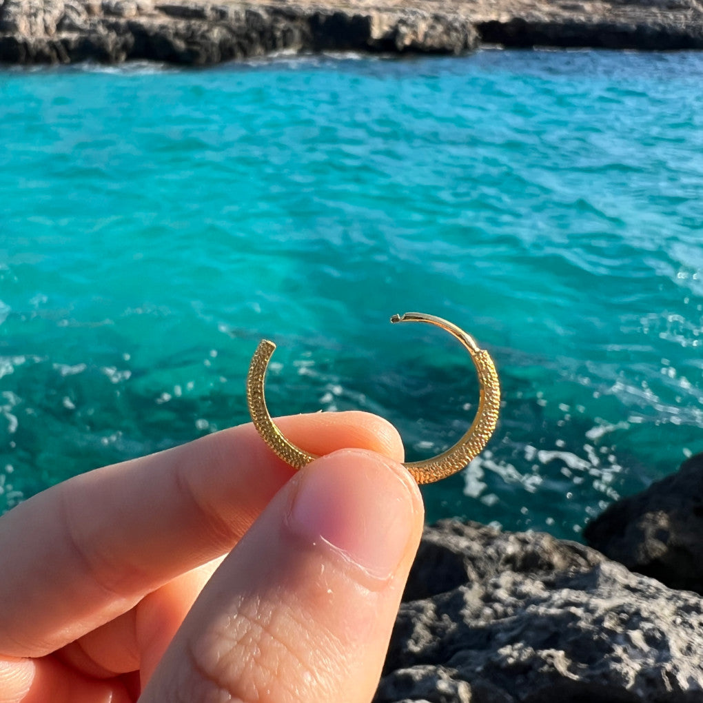 El básico del joyero, los pendientes NIRE son un aro con un toque diferente. Puedes escoger entre dos medidas: 15mm o 20mm. Ambas son ideales para llevar en tu día a día. Son muy cómodos y ligeros.